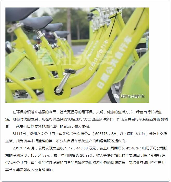 如今,永安行已成功登陸上交所主板。對(duì)于永安行來說,本次公開發(fā)行上市是一個(gè)契機(jī),來保持和強(qiáng)化公司目前的領(lǐng)先市場(chǎng)地位,并充分利用近年來行業(yè)高速發(fā)展的有利條件,以公共自行車系統(tǒng)為核心產(chǎn)品,豐富業(yè)務(wù)類型,促進(jìn)用戶數(shù)量快速提高,推動(dòng)公司業(yè)績(jī)持續(xù)健康增長(zhǎng)。接下來永安行還將借助資本平臺(tái)來保持企業(yè)的長(zhǎng)青發(fā)展。