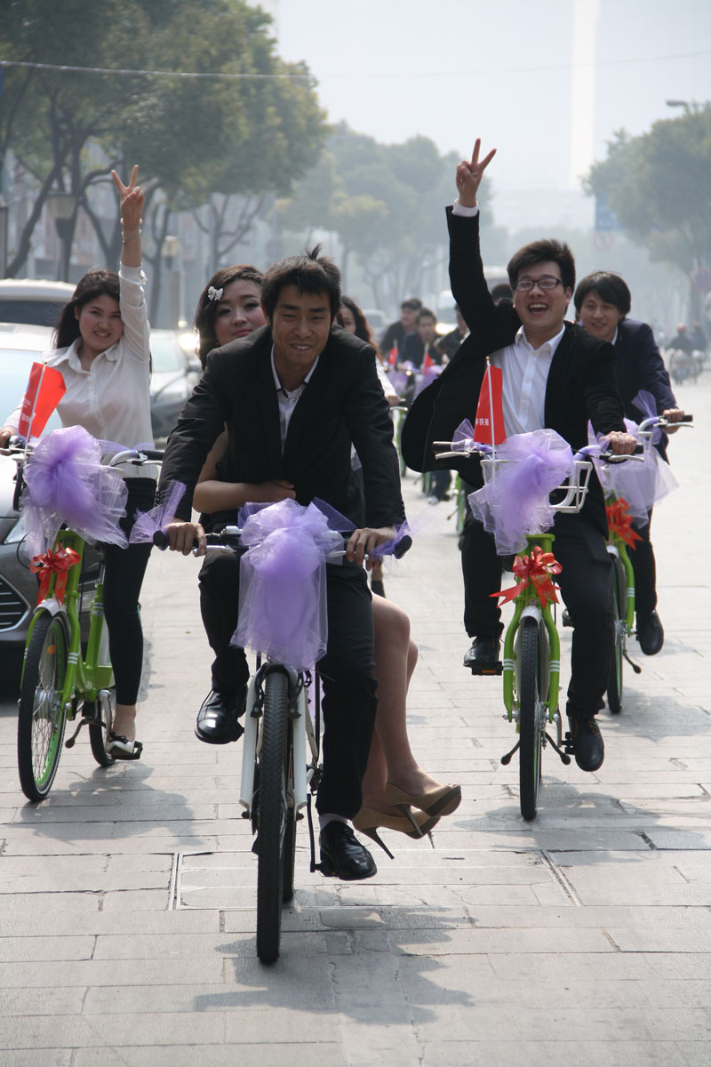 今天上午,專做婚慶活動的山東小伙為自己辦了一場低碳而又浪漫的自行車婚禮,20輛草綠色的公共自行車組成了“豪華”車隊,迎娶他那美麗的新娘。