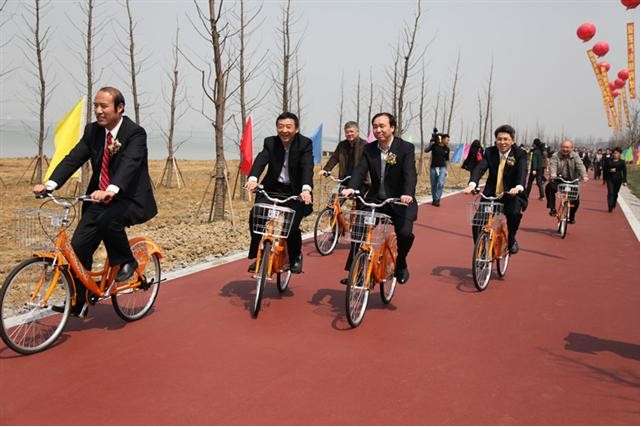 2012年3月26日,環(huán)太湖風(fēng)景路建設(shè)啟動(dòng)儀式在吳江市與浙江省湖州市吳興區(qū)交界處舉行,參加啟動(dòng)儀式的國(guó)家住建部總工程師陳重、江蘇省副省長(zhǎng)何權(quán)、浙江省副省長(zhǎng)陳加元等領(lǐng)導(dǎo)在蘇州市副市長(zhǎng)吳江市委書記徐明、吳江市代市長(zhǎng)梁一波的陪同下,到吳江濱湖新城生態(tài)公園體驗(yàn)公共自行車。