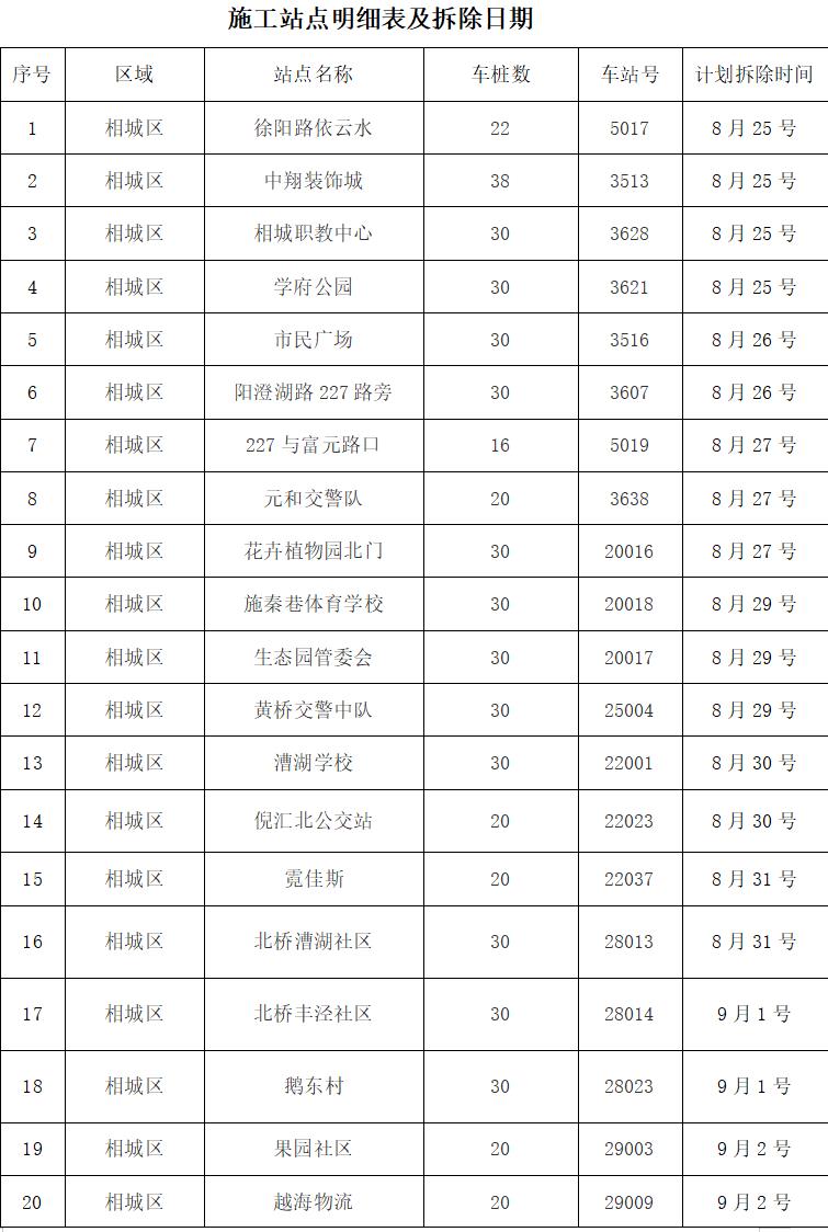 因公共自行車(chē)站點(diǎn)運(yùn)營(yíng)調(diào)整,蘇州市現(xiàn)有52個(gè)站點(diǎn)將于近期拆除,給您帶來(lái)的不便敬請(qǐng)諒解。具體拆除站點(diǎn)及施工安排時(shí)間如下: