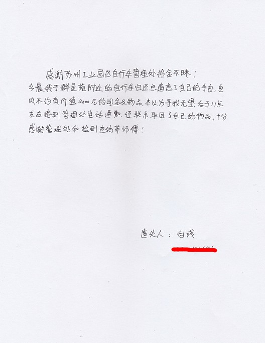 失主認(rèn)領(lǐng)后非常感動隨及拿出一部分作為酬謝,被茆師傅和李師傅婉言拒絕!失主非常感動,他說:“我是從北京到蘇州旅游的。今天在園區(qū)金雞湖附近游玩不慎將包遺忘了。本以為找不到了,沒想到不超過2小時你們就聯(lián)系到我了,非常感謝你們。蘇州園林真美、蘇州市民的素質(zhì)真高!”