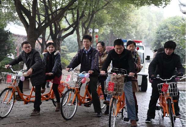 2月14日,吳江推出雙人公共自行車(chē),分別投放于吳江公園和蘇州河,由于恰逢西方情人節(jié),所以借此機(jī)會(huì),在吳江公園內(nèi)舉辦了“情侶同騎雙人公共自行車(chē)”的活動(dòng)。12點(diǎn)58分活動(dòng)按時(shí)進(jìn)行,雖然陰雨蒙蒙,但經(jīng)過(guò)的情侶都會(huì)停下來(lái)看看這"稀罕"的雙人公共自行車(chē),在工作人員的鼓勵(lì)下,情侶們紛紛踏著雙人自行車(chē)?yán)@著公園騎了起來(lái)。另外,只要試騎雙人公共自行車(chē)的情侶都可以領(lǐng)取工作人員準(zhǔn)備的玫瑰花和巧克力。